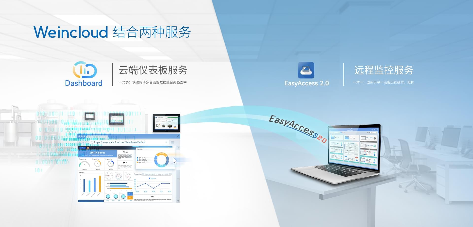 Weincloud 集結EasyAccess2.0遠程監(jiān)控服務及Dashboard云端儀表服務,將設備資料數據上云并以視覺化呈現,協助管理者實時掌控現場產線狀態(tài)。